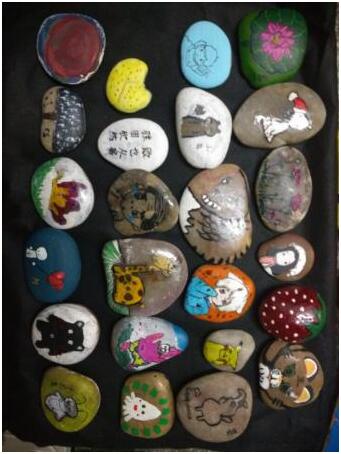 在石玩创作的现场,参与石玩创作的成员都积极发挥自己的创意,在普通的鹅卵石上写字、画画,她们根据石头的不同形状进行了不同的创作,草莓、荷花、史卢比、皮卡丘……普通的石头经过一番创作变成了“宝石”。