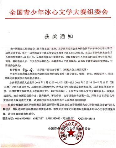 该文学大赛由中国智慧工程研究会(教育部主管)主办,文学教育委员会承办。大赛采用网上报名的方式,征文从2016年1月1日开始,历时三个月,征稿40余万份,来自全国各地的文学爱好者用自己的笔触,写下心中对“爱心、孝心、慈善”最真的感受。