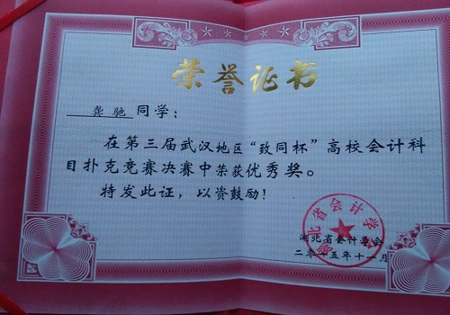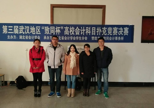 团委网11月26日消息(通讯员 王悦) 11月26日,商学院会计协会的四名选手在会长夏莉的带领下赴中南财经政法大学武汉学院参加扑克大赛,最终获得四个优秀奖和一个团体优秀组织奖。
