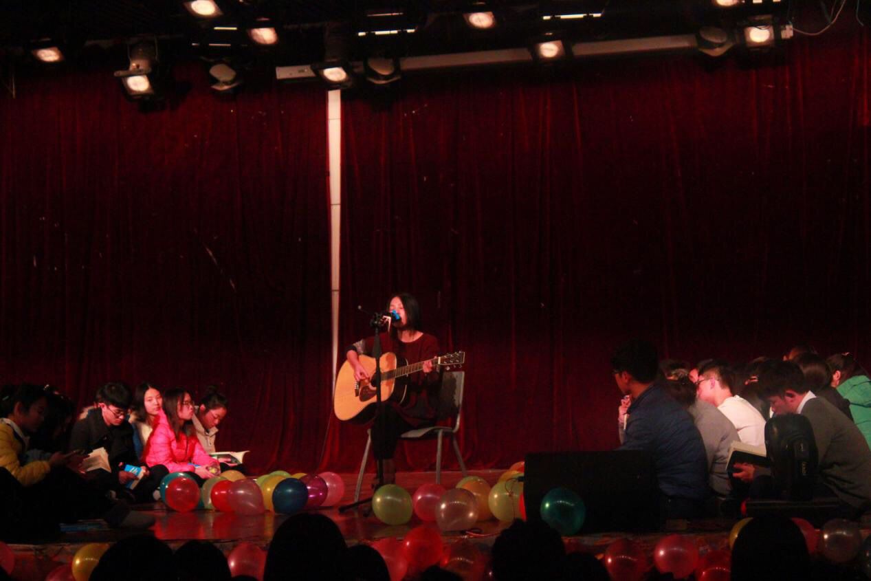 首先上场的是陈昕宇,一首民谣弹唱伴随着清澈的嗓音缓缓流淌,一种独特的感染力,让在场的同学们都沉浸在其中,感受它特有的魅力,随后的提问互动环节,她结合自己的经历,更是让许多同学惊叹她身体里的那份力量。