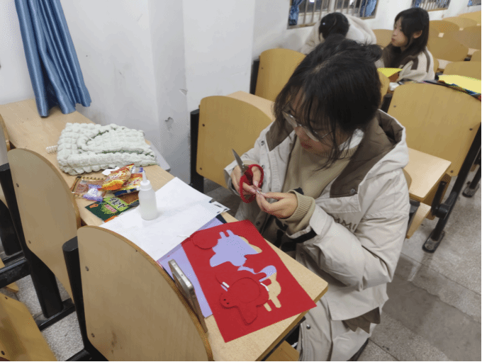 活动伊始,指尖手工坊社长刘禹漩对到场成员表示热烈欢迎,副社长聂乐欢和许靖雯将提前准备好的饼干、糖果等分发给在场成员,现场氛围轻松融洽。随后,为使零基础同学快速掌握手工技能,刘社长通过实物演示与步骤讲解的方式详细介绍了本次手工活动的主题——不织布挂件制作。之后,几位社长组织成员选择自己所需不织布颜色,并有序分发制作材料。活动过程中,社长们有条不紊地在教室巡视,及时为成员提供帮助答疑解惑,指导成员们完成各自心仪图案的制作,保障了活动的顺利推进。