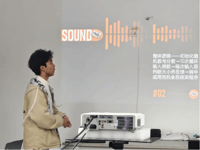 在活动展示环节,第一组率先上台展示小组成员共同创造的猜字游戏项目,讲明了“随机数输入数字,猜出最终结果”游戏规则并对游戏运行成果进行展示。据开发团队介绍,该程序的核心在于其严谨的代码结构。通过 srand((unsigned)time(NULL)) 设置随机数种子,确保了每次游戏数字的随机性与公平性。演讲者以生动的比喻,将随机数种子的初始化比作“播下种子”,让晦涩的技术概念变得通俗易懂。其他小组也将各具特色的项目结果呈现。这不仅是对技术理解的考验,更是对沟通与提炼核心信息能力的挑战。