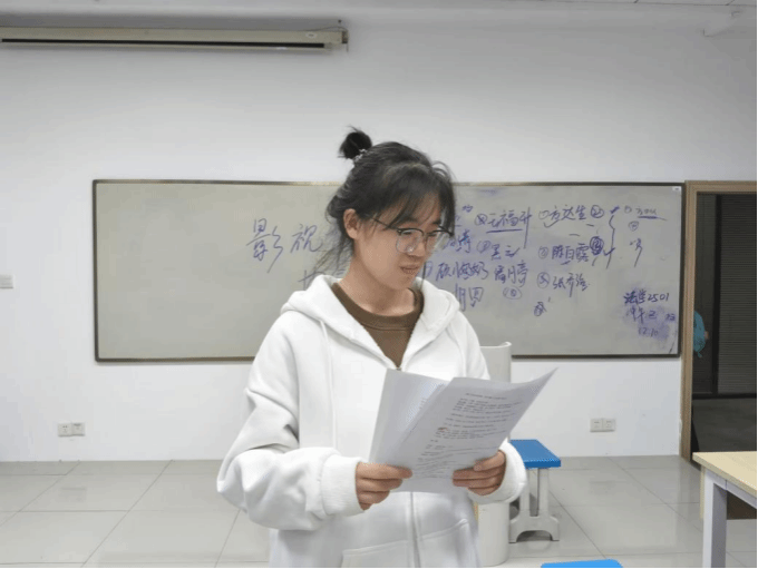 活动结束后,全体人员合照留念。记者采访到汉语言2503班的徐欣颖同学,她表示:“这是我第一次如此深入地接触《日出》。过去在文学课上,我们更多是从文本分析的角度理解这部作品。但今天,当我真正站在舞台上,尝试用声音、表情、肢体去诠释人物时,我感受到了完全不同层次的震撼。这种体验让我对曹禺先生的作品有了全新的认识。”