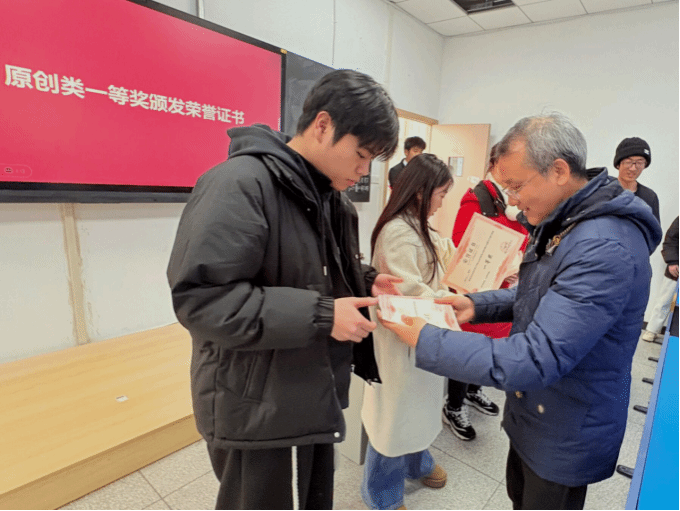 在颁奖仪式过程中,主持人宣布AI类作品一、二等奖获奖者名单,颁奖老师为其颁发荣誉证书与奖品。同时,主持人解读了设立该奖项的核心意义:认可同学们依托算法与数据开展语言实验的创新实践,彰显技术赋能下的叙事创新与诗意表达,为传统写作注入跨界视角,呼应学院对数字人文前沿趋势的积极探索与教学实践。