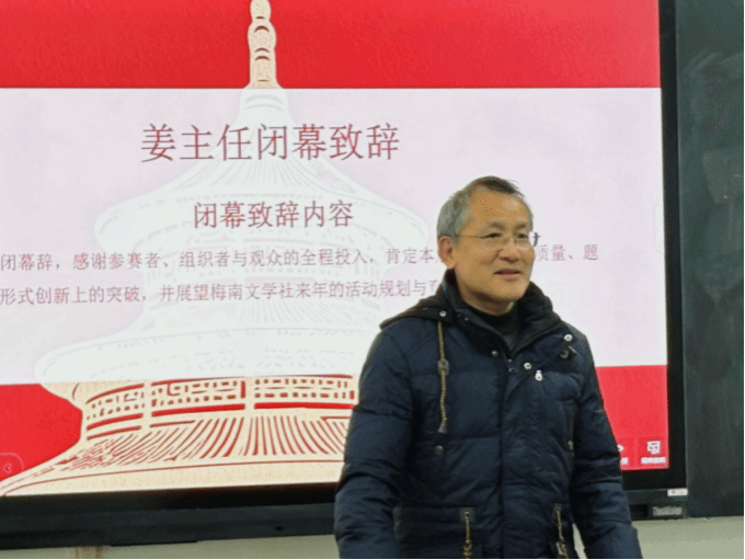 颁奖仪式结束后,姜主任发表闭幕致辞。他首先向全程投入的参赛者、组织者与观众表示感谢,肯定了本届大赛在作品质量、题材广度与形式创新上的突破,并展望了梅南文学社来年的活动规划与育人目标。受现场氛围感染,姜主任现场献唱柳永《八声甘州》,为本次颁奖仪式画上圆满句号。