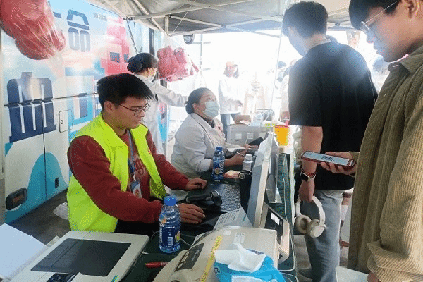 活动当天,志愿者们将为本次活动准备的零食、牛奶以及纪念奖品等物资摆放整齐,布置好精心设计的互动游戏场地,同时细心地解答前来咨询的同学的问题。十点左右,移动献血车辆在相关人员的引导下停在了规定区域,志愿者们协助医护人员放好器材,并在了解设备的使用方法和献血流程后,妥善分配了各自负责的工作,保证后续活动有条不紊地进行。