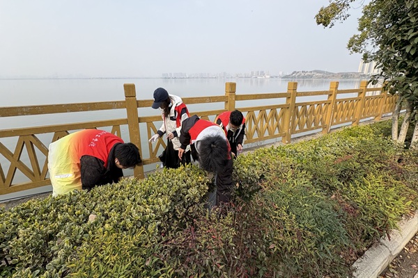 活动当天,志愿者们准时集合,身着统一志愿服装,手持垃圾夹、垃圾袋等清洁工具,有序前往环湖区域开展清扫工作。大家按照分工,沿着湖边步道、绿化带、岸坡等区域逐一清理,仔细捡拾路面、草丛、角落处的烟头、塑料袋、饮料瓶、纸屑等各类垃圾,不放过任何一处卫生死角。面对藏匿在灌木下、台阶缝隙里的杂物,志愿者们还会互相配合,俯身捡拾,将隐蔽处的垃圾逐一清理。虽然天气微凉,但大家参与志愿服务的热情高涨,用一次次弯腰、一次次捡拾,为守护湖畔生态环境贡献青春力量。经过一个多小时的共同努力,环湖步道和湖边环境有了明显的改变。