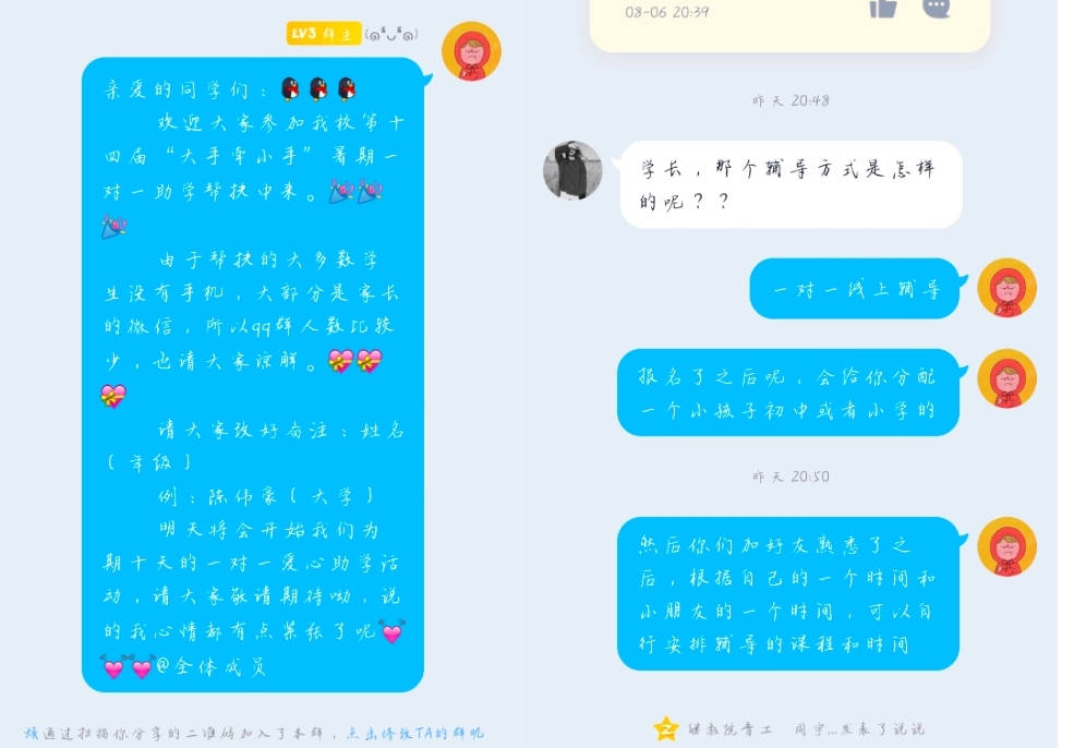 活动刚刚举办就有许多同学积极参与报名,可以充分看出我校学子具有积极奉献、大爱无私的志愿精神,在严酷的暑假他们依然拥有一颗热情的心,志愿者身上值得我们广大青年们去学习。志愿者们的激情无限,怀着对孩子们的的关怀,对他们孩子们未来的期望。以及对知识的尊重,报名的同学说“加入这次活动让我感受到小朋友对于学习的热情,他们很认真,我也很开心能够加入他们的学生生活,为他们进行辅导”相信这次活动的开展也会吸引很多同学的加入,大家相互鼓励,互相加油,从中体验更多生活学习的技巧。我们记者也采访到了暑期线上助学的本次活动的负责人校青年志愿者协会志愿管理部部长--陈伟豪同学表示;“这次活动的开展方式为线上一对一辅导,根据志愿者和小朋友们的时间自己制定一个特色辅导方案,希望武昌理工学院的学子们能够积极的参与进来,后续也会有很多的小朋友们报名加入。为期十天的一对一爱心助学活动让大家的心情都十分激动,这次活动的开展,同学们需要通过自主备课给孩子们进行辅导,会体验到当老师的感受,给予同学们一个学习的机会,一个成长的空间,一个提升自我的契机。”