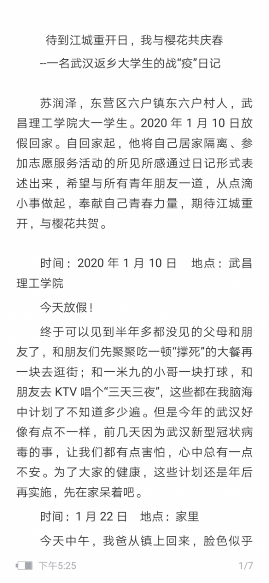 2020年1月10号,武昌理工学院影视传媒学院苏润泽返乡后自行居家隔离14天,并在隔离期结束后在家乡自愿参与志愿服务活动,他在服务过程中以自己的真实情感用日记的表达方式呼吁和鼓励全国人民共同打赢这场没有硝烟的疫情战役!