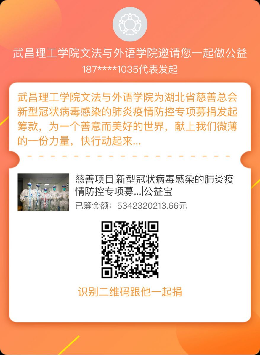 本次献爱心活动主要向为湖北省慈善总会新型冠状病毒感染的肺炎疫情防控专项募捐筹款,毛斌主席发起后,得到了广大学生的积极响应和支持,大家都积极行动,参与爱心捐款。据悉,本次活动主要有物资捐助和善款捐助,物资捐赠:向天下熔铸事业捐赠一项护目镜,通过顺丰快递为需要的人捐赠30只口罩。善款捐赠:为青山志愿者捐助418元套餐话费,同时也向湖北省红十字会、武汉红十字会、湖北省慈善总会等共计34个机构和组织捐助5916.67元人民币,进一步彰显了文法与外语学院学子的大国担当和社会责任感。