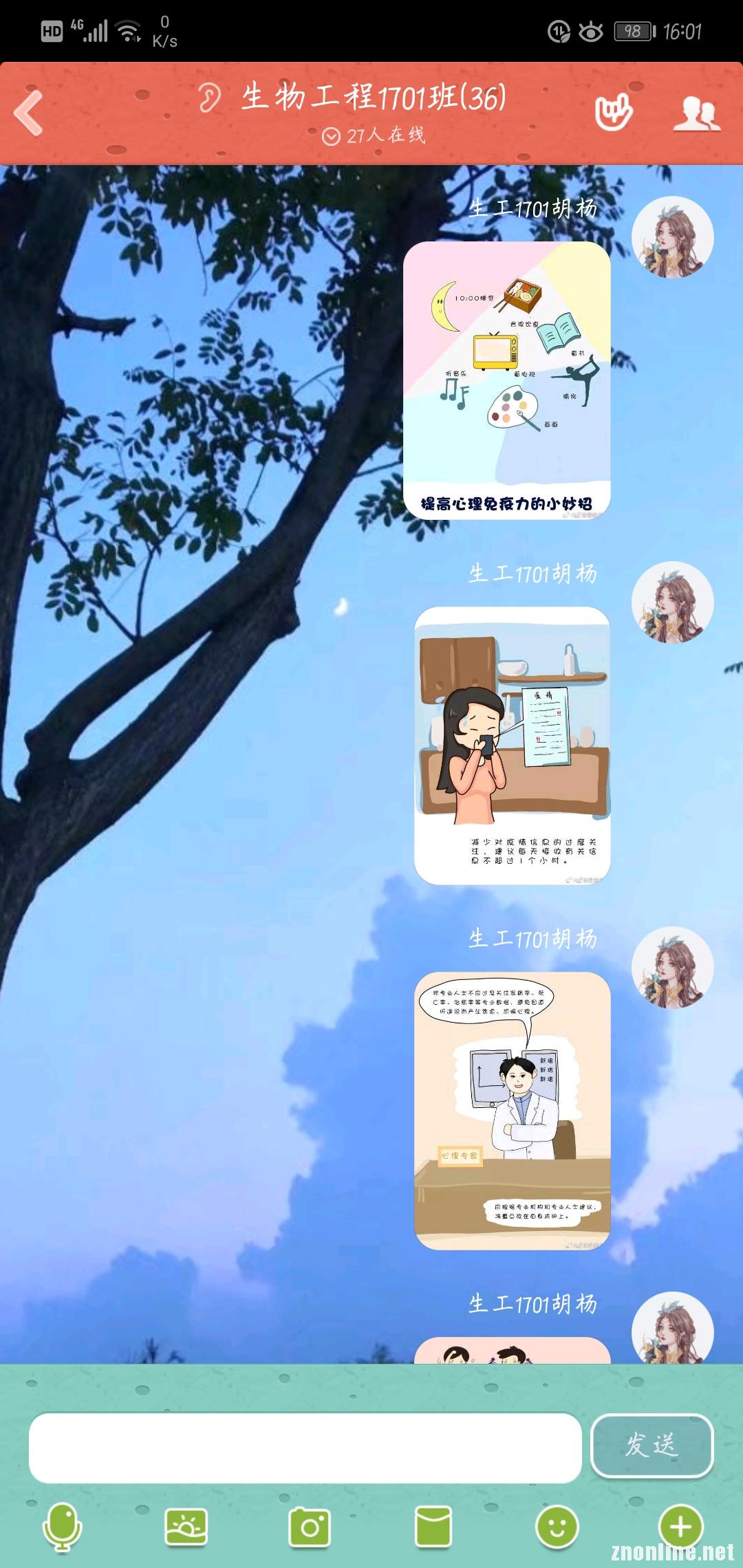 以班级为单位,通过QQ群,微信群等网络方式,将国家卫健委、央视新闻等主流媒体关于疫情防控的图片、文档以喜闻乐见的方式传达给每一位同学,既加强了学生们的疫情防范意识,又提升了班集体的凝聚力和向心力。