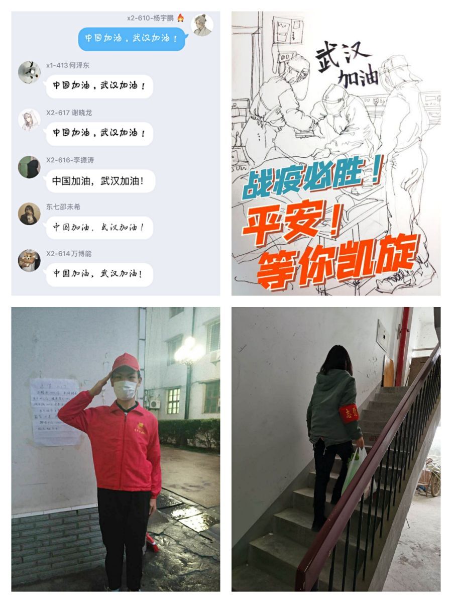 在疫情面前,他们不惧艰难,积极投身到家乡抗疫志愿行列之中。副班长谢晓龙告诉记者:“作为一名当代大学生,就应该勇于担当,有责任和义务为疫情防控贡献自己的一份力量。作为共青团员,加入防疫工作就更加义不容辞,虽然力量微小,但我想尽我所能为家乡贡献力量。”团支书杨宇鹏同学号召大家在保证自身安全的情况下,走出去,在自己家乡的疫情战场上出出自己的一份力。团支书杨宇鹏在自己解除隔离后,主动带头行动,联系自己所在小区的物业,帮助行动不便的业主采购配发生活物品,并帮助物业进行小区进行消毒工作。文艺委员熊嘉婧同学发挥自己的特长,用绘画的方式向奋战在一线的医护工作者致敬。欧阳昕晨同学与朱若怡同学,在得知自己小区被封锁大家生活不便的情况下,主动联系社区,帮助配送分发业主所需要的生活用品。杨丽娜同学,在老家随州,主动帮助村支部为进出人员测量体温宣传防疫知识,认真细致的讲解新型冠状病毒的危害及预防措施,言语间满是对社区居民的关爱与担忧,熟练的使用体温检测计为社区居民的健康护航。在班会的最后全班同学在班级QQ群中纷纷发出中国加油,武汉加油的文字,为祖国和武汉祈祷。