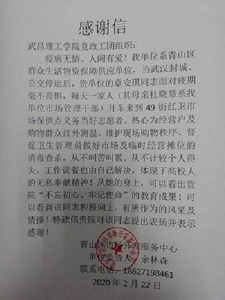 在志愿者工作结束后,武汉市青山区市场开发服务中心给章安琪所在的单位发来感谢信,信中表示对章安琪的无私奉献精神和武昌理工学院“不忘初心、牢记使命”的教育理念提出表扬和感谢。面对表彰,章安琪说到:“病毒并不可怕,可怕的是个人防护不到位,希望在这次疫情中我可以尽到自己的一份力量,尽量让大家不被感染。”(完)