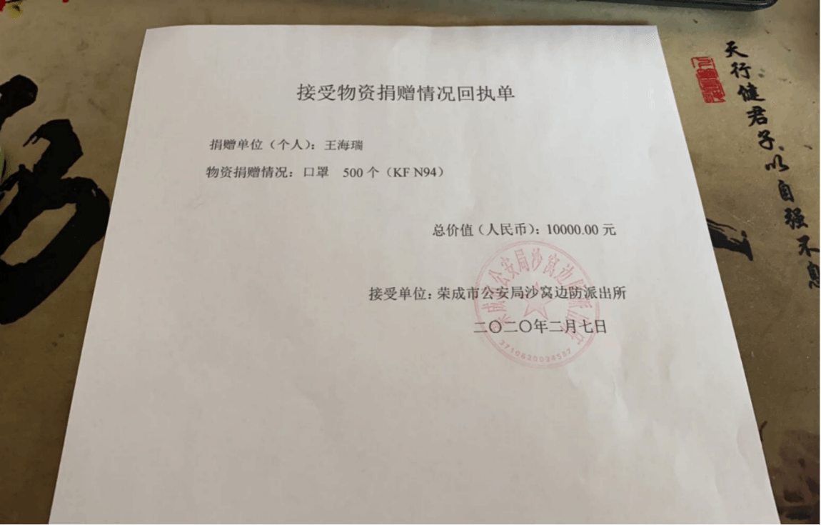 疫情严峻,很多地方都缺乏基本的医疗物资,对于这一点,王海瑞意识到:“我们虽然不能像武汉的白衣天使冲在前线,但是我们可以做出自己的贡献。”特别是在全国人民都难以买到口罩的情况下,王海瑞积极地想办法应对,并提供相应的援助给有需要的医护人员,助力援“疫”。在这次捐助后,他受到公安部门的表彰,以及父母、老师、同学们的支持与鼓励,这让王海瑞更加努力地为疫情助力。