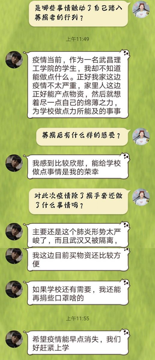 据悉,因为疫情形势太严峻,武汉市又被隔离,他所能做的仅仅有限。他说道“疫情当前作为一名武昌理工学院的学生,我不知道能做点什么,正好这边疫情不太严重,家里人这边正好能产点物资,然后就想着尽一点自己的绵薄之力,为武汉市做点力所能及的事情。”常劭珂和他的家人为这场“没有硝烟的战争”默默提供着支援,他谈及到如果学校还有需要,他还能在捐献一些口罩等医疗物资,他充分发挥身边的医疗资源,为抗击疫情做出最大的奉献。常劭珂的行为让人感动,这也是武昌理工莘莘学子的奉献精神。