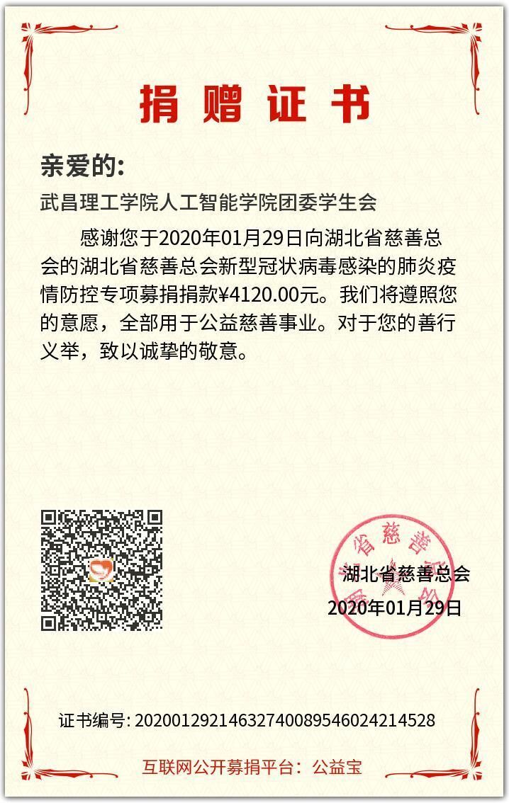 连日来,疫情牵动着全国各地人民的心。为了增强人工智能学院广大师生的民族自豪感和民族凝聚力,为了共同为社会的美好建设尽自己的绵薄之力,人工智能学院团委学生会开展了以“抵抗疫情,智能有情”为主题的募捐活动,以爱心捐款为载体,以成功素质教育理念为特色,致力于培养“专业素质扎实、通适素质过硬、创新素质突出”的高素质人才为主线,展示当代大学生的青春梦想与责任担当。