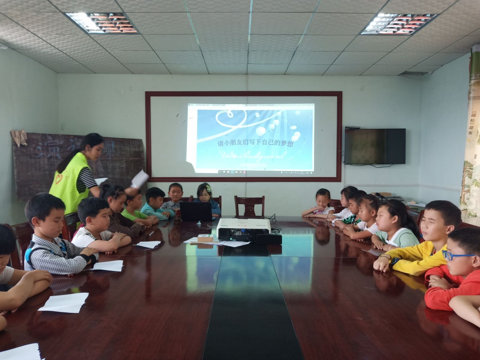 当日下午16时,志愿者老师黄晓燕宣布“我的中国梦”主题班会正式开始。活动伊始,志愿者黄晓燕通过列举周恩来、鲁迅、曼德拉等伟人的立志故事直接切入主题,激发同学们梦想的畅想。随后,同学们一起学习并背诵了爱国诗《过零丁洋》。之后在老师的提议下,同学们一起闭眼静思1分钟,思考自己的梦想是什么,原因是什么,如何行动。最后,在老师的要求下,学生们都将自己的想法一一写在白纸上并分享给大家。班上一位身材瘦小的同学阳佑周说“我的梦想是成为一位领导者。”这时,其他的小朋友突然哄堂大笑。这时,黄晓燕老师让同学们安静下来,请阳佑周同学谈谈内心深处的想法,他说“我要先去当一个小小的兵,然后一点一点的壮大自己,成为一位伟大的军官,”刹那间,教室里掌声一片。