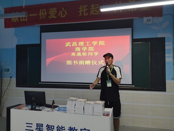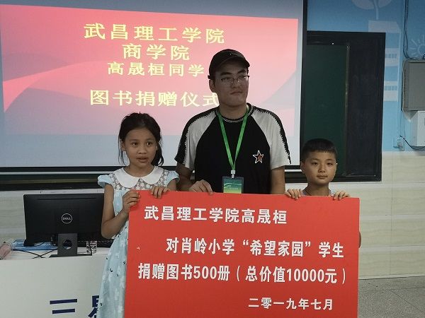 团委网7月25日消息(记者 邱文辉 报道)7月24日上午,我校商学院布谷学堂支教队下属崇阳县肖岭乡支教小分队联合共青团崇阳县委在肖岭中心小学举办了一场爱心捐赠仪式,肖岭乡支教小分队成员高晟桓现场捐赠了500册图书,总价值1万元人民币。