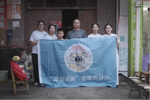 交流结束后,“幸福笑笑”合家欢拍照活动成为本次回访的核心环节。志愿者提前备齐专业相机、幕布等道具,在室内选取光线适宜的区域搭建临时拍摄场景。拍摄前,志愿者细致调整现场布置,协助家庭成员整理衣着,通过引导自然站姿、提示放松表情等方式,帮助大家展现最真实的状态。