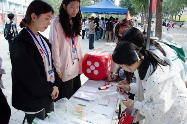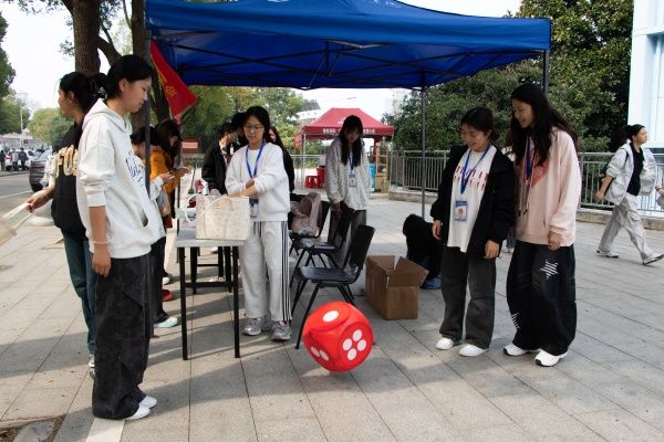 活动伊始,“祈福风筝工作坊”便吸引了众多同学驻足观看,大家争相领取空白风筝和绘画工具,动手绘制各式图案,写下诚挚的祝福。这些色彩缤纷的风筝,既寄托对长辈的深情思念和美好祝愿,也映照出青年学子对未来的憧憬与向往。在“银杏书签制作区”,手巧的同学利用银杏叶,领取笔和塑封纸,精心制作出独一无二的精致书签;在“赞美传递站”,学生会成员积极分发便利贴,同学们以纸为载体,倾诉对师恩的感激和对长辈的感恩之情;重阳佳节,欢声笑语在“三掷成‘祥’”游戏区此起彼伏。同学们通过掷骰子赢取奖品,在轻松愉快的氛围中享受节日的快乐,同时也寄托了对吉祥安康的美好期望。