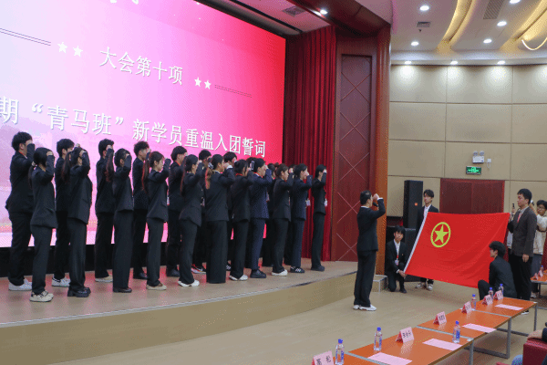 紧接着,第九期青马班新学员代表孟思彤代表发言。她表示:“作为第九期青马班新学员,我们定将坚定理想信念,脚踏实地奋斗,接过学长学姐的接力棒。以青春之力勇担时代重任,在实现民族复兴的征程中书写属于我们的担当与荣光。”第八届与第九届青马班成员代表上台进行班旗交接仪式,李金永部长为其授旗。一面旗帜,传递的不只是责任与担当,更是对他们未来的期望。朱珈仪同学带领第九期青马学员重温入团誓词,他们坚定地高举右手面向旗帜,以铿锵之音郑重宣誓。
