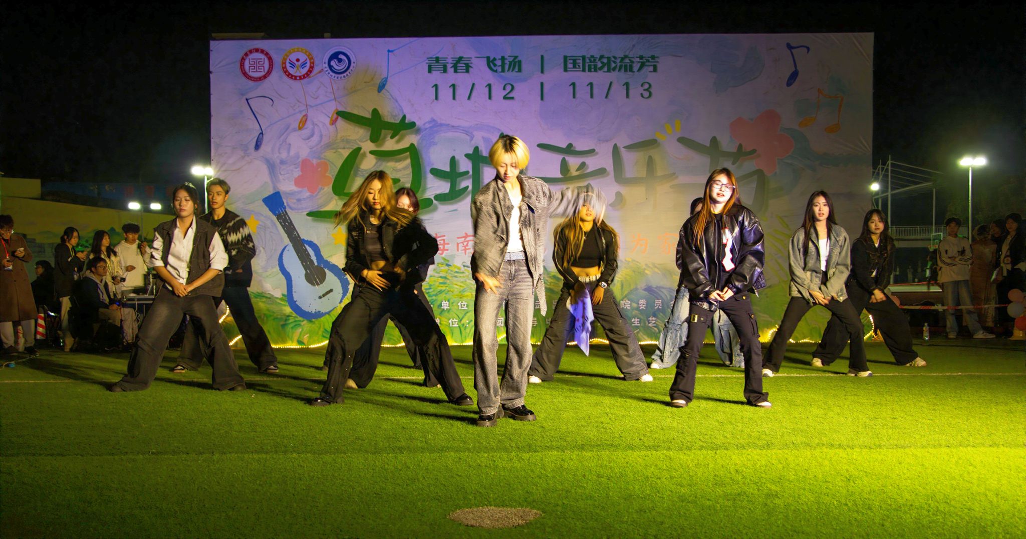 伴随着同学们的热烈掌声与欢呼声,首日活动正式拉开帷幕。首先登场的乐队所演奏的《不再犹豫》由一段极具辨识度的吉他riff直接将现场氛围调动了起来;紧随其后的是《Burning up》舞蹈,舞者们用充满力量的舞步展现着青春的活力;复贤国学社带来的《秀启风华》古风走秀,模特身着交领襦裙、曲裾深衣等精美汉服,手持团扇、油纸伞款款而行,鬓边簪花映着灯光,古典美学与现代舞台碰撞出别样火花;随后,方言小游戏等互动环节趣味十足,在欢声笑语中传递地域文化魅力,而大学生艺术团带来的《方的言》也让 “方言里的乡愁” 与国韵主题深深呼应。武术协会的表演环节更是高潮迭起,表演者招式利落、气韵贯通,将中华武术的刚劲风骨展现得淋漓尽致,台下观众屏息凝神,结束后爆发出雷鸣般的掌声。《手心的蔷薇》《我只在乎你》等兼具柔情与力量的歌曲接连登台,《THUNDER》《so cool》等动感舞蹈穿插其间,传统韵味与青春活力无缝衔接,持续推高现场氛围;临近尾声,《晚安》的温柔旋律缓缓流淌,全场学子齐声合唱,温暖的歌声在夜空回荡,为 “国韵雅集” 篇章画上圆满句号。