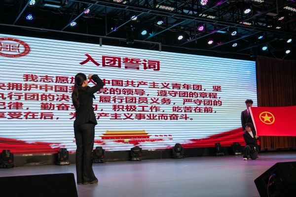在入团宣誓中,铿锵誓言响彻会场,坚定了新团员献身共产主义事业,终身为之奋斗的信念。随后,来自文法学院的新团员代表刘紫竹同学登台发言。她表示,加入共青团不仅是一份光荣,更意味着肩负时代的担当。她以实际行动响应时代号召,致力于为社会贡献自己的力量,并承诺继续投身于实践活动中,以青春和汗水为社会增光添彩。