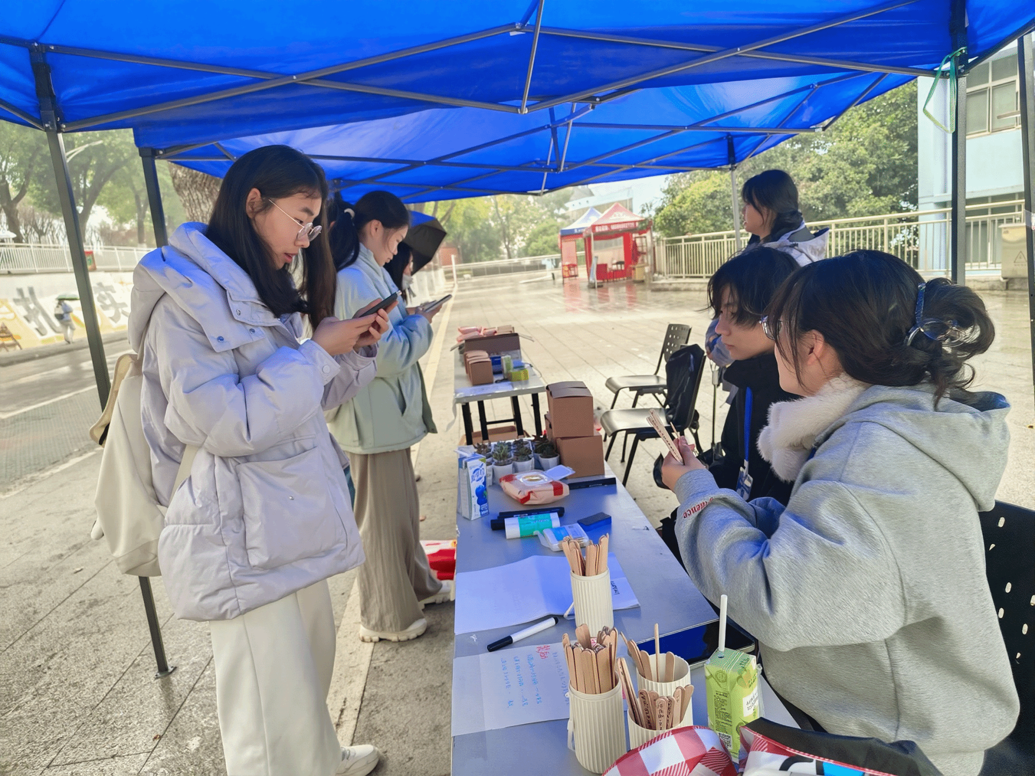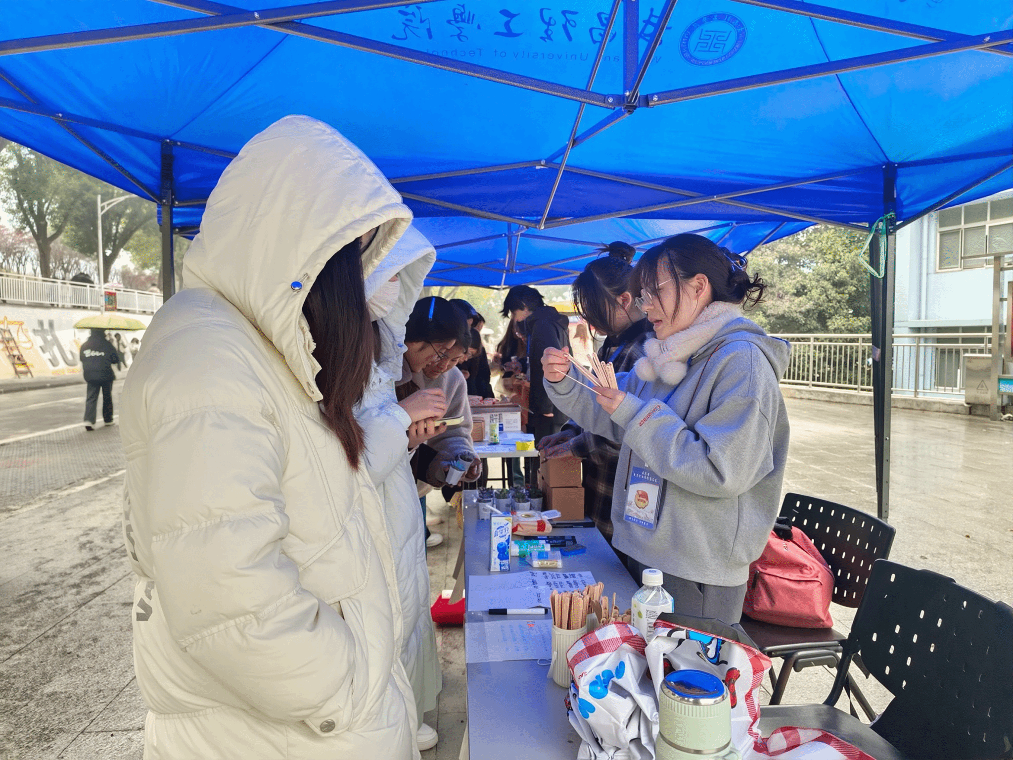 活动现场设置知识竞答、趣味抽奖、废旧物资回收兑换三大核心互动环节,流程清晰、安排有序,充分调动师生参与热情。尽管冬日气温较低,但东区文化广场欢笑声与讨论声抵过冬日,各点位前都排起了队伍,学生们在趣味互动中学习知识、分享观点,现场气氛热烈而有序。在《安全知识竞答》环节,参与者随机抽取竹签答题,题目涵盖实验室规范、宿舍用电、应急自救等内容,帮助学生在互动中掌握实用的安全常识,有效普及了校园安全常识;《好运来来》环节里,学生完成线上调查问卷后可参与盲盒抽取,盲盒含钥匙扣、糖果等礼品,现场互动热情高涨;而《纸壳摇身变绿植》环节则紧扣环保主题,学生将废纸壳送至指定点位登记后,可凭一个纸壳兑换一株小绿植,这一设置传递资源循环、绿色再生的理念,许多同学表示,这个环节让他们直观感受到‘变废为宝’的成就感。