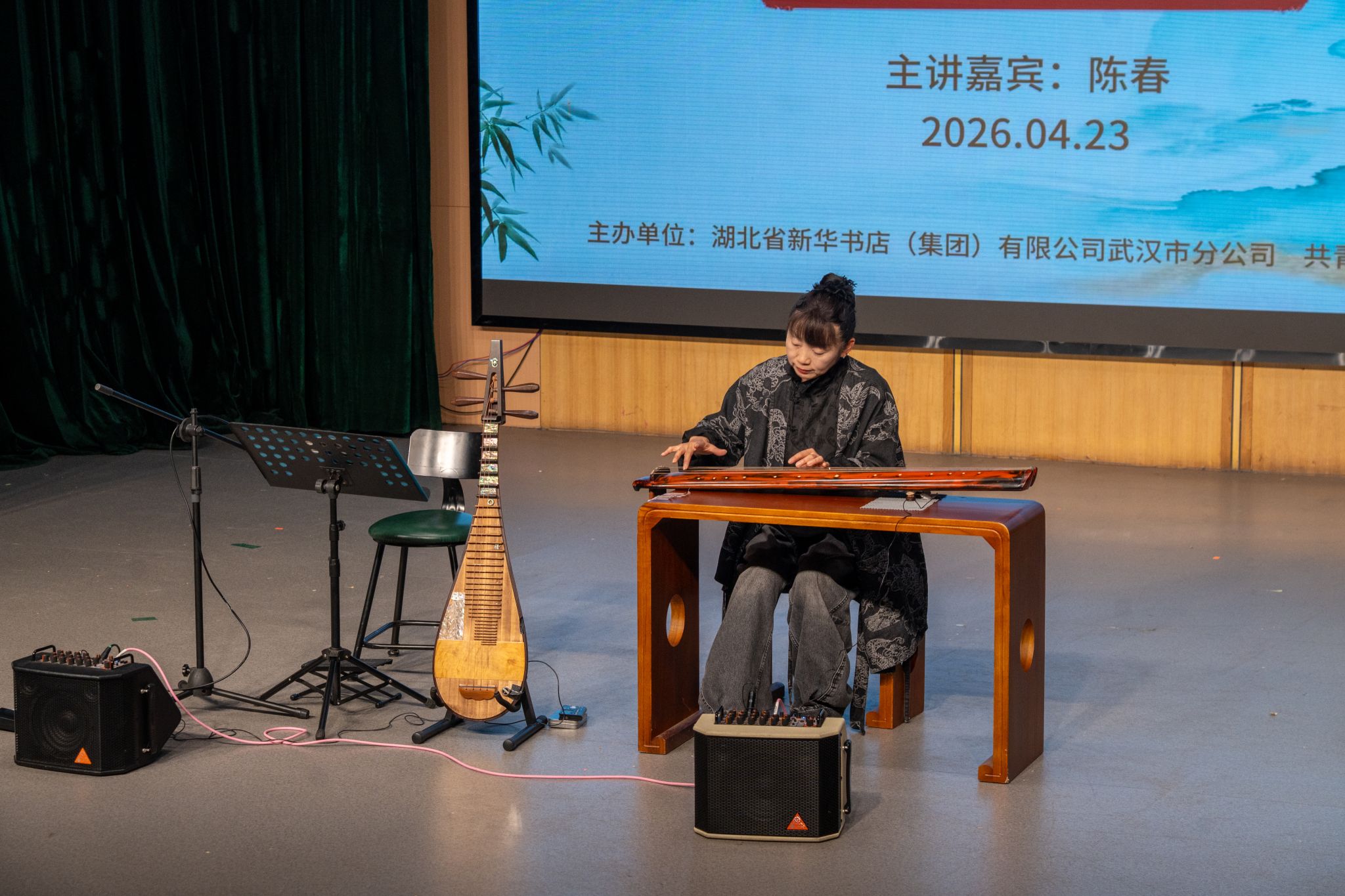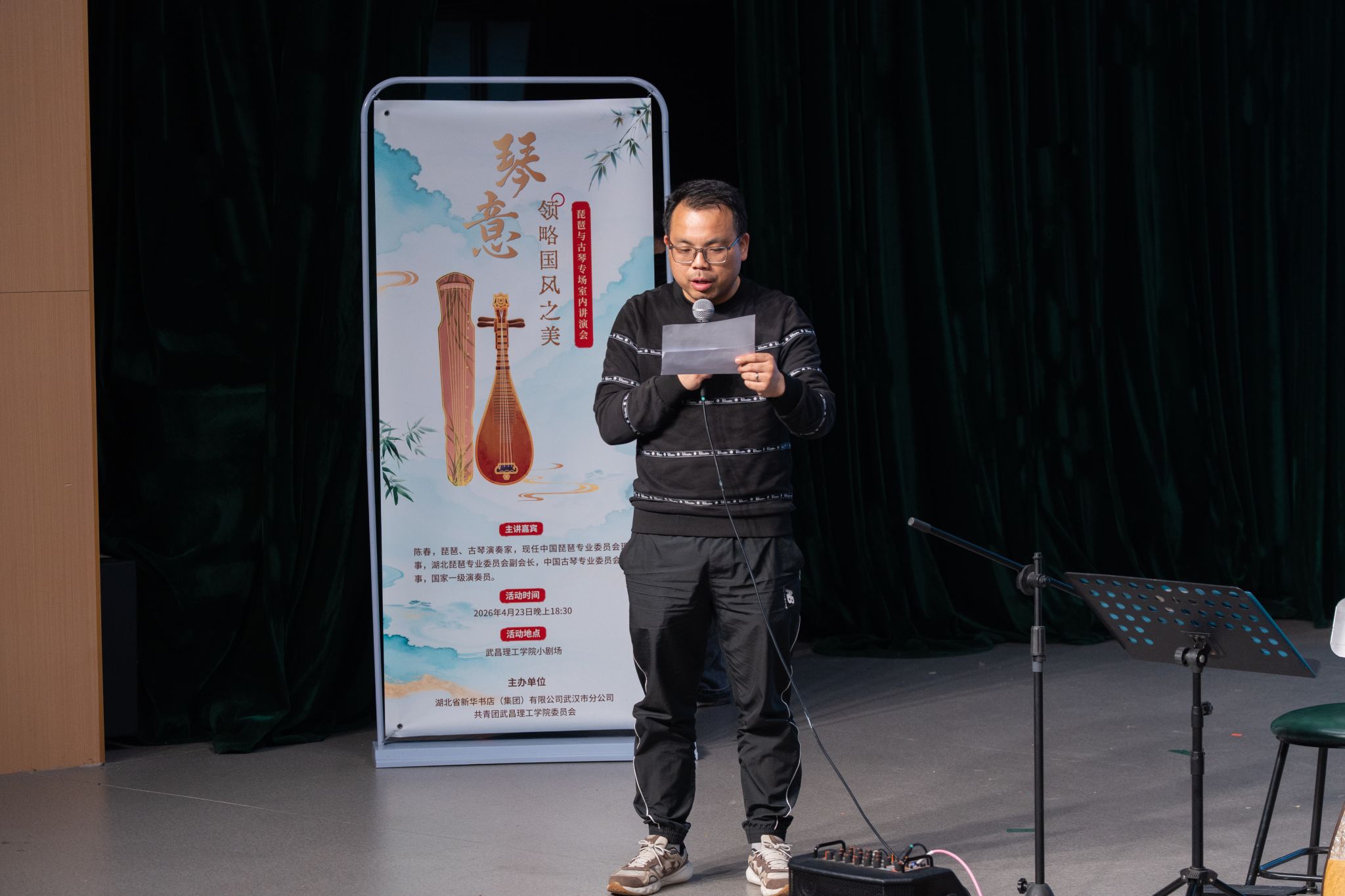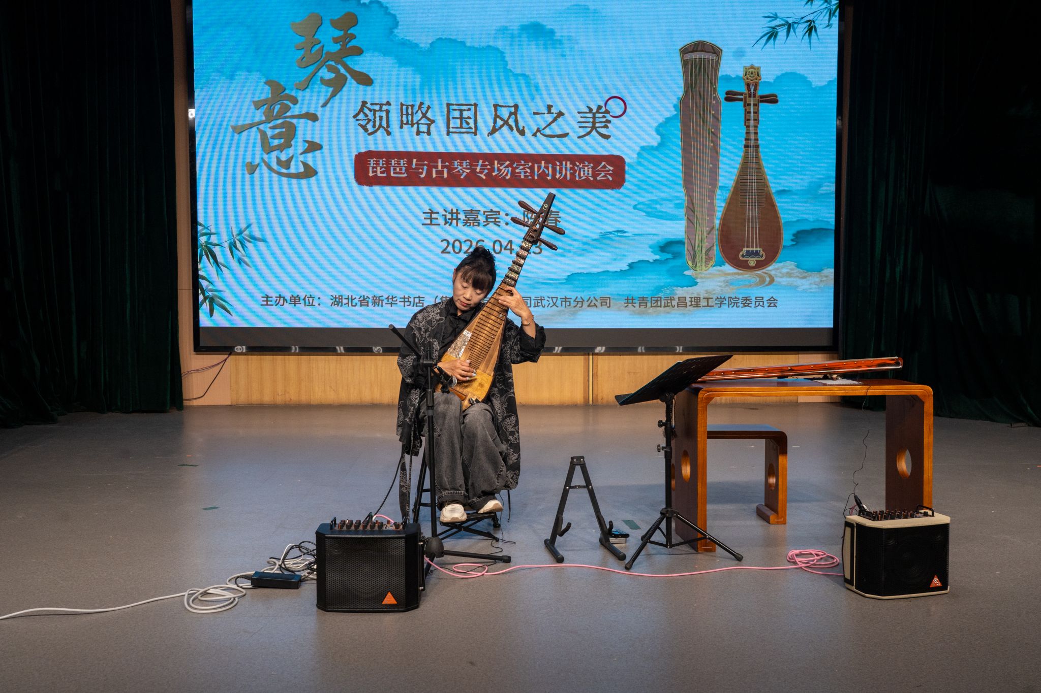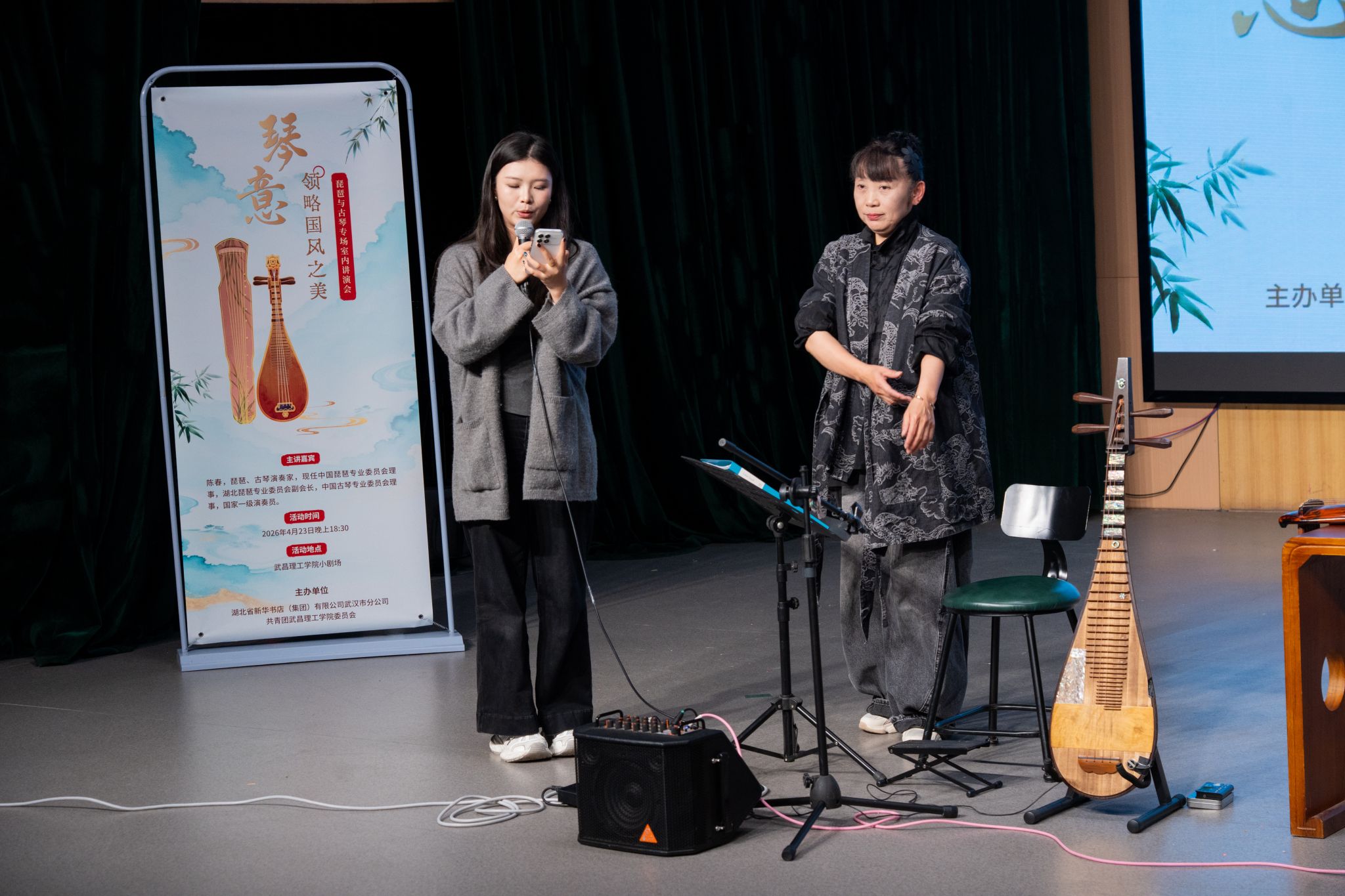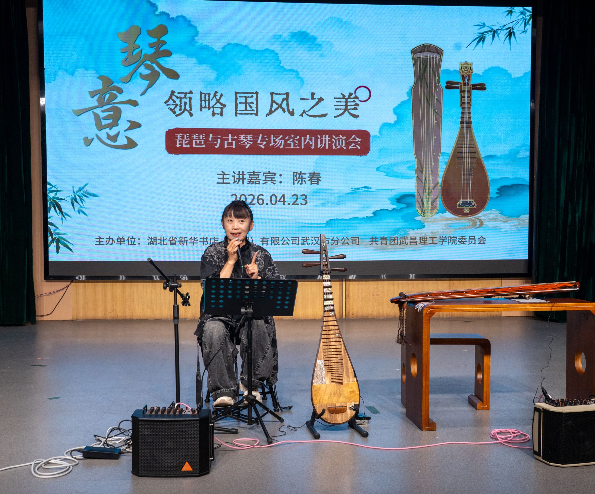 团委网4月23日消息(记者 董心宇 易成豪 陈俊彤 见习记者 胡思雨 潘雨轩 张涵杰 报道)“乐者,心之声也;礼者,行之仪也。”为厚植学生文化底蕴、提升艺术审美素养,传承中华优秀传统音乐文化,4月23日晚,武昌理工学院“高雅艺术进校园”主题活动——琵琶与古琴专场室内讲演会,在影视传媒学院310剧场温情启幕。本次活动特邀国家一级演奏员、琵琶古琴双栖演奏家陈春老师亲临主讲并演奏,党委委员、校团委书记杨瑞出席并致辞,全校百余名师生共赴这场国乐盛宴。