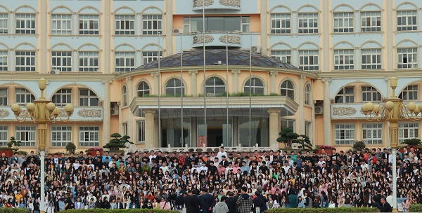 红日高悬,在暖融融的阳光下,各学院各专业的师生们在成功广场上聚集,嘈杂的人声里伴着欢声笑语。夏虫不算喧嚣,然而别离的号角却已悄悄奏响,又湮没在交汇的视线里,随着清晨的露水一同蒸发——别离尚且遥远。拍摄阶梯架在行政楼的阶梯前,共有八层。1200余名师生站出长长的队列,在摄影师的指挥下站定位置,随着相机的轻微“咔嚓”声,笑容定格在照片里,剪下校园里的郁郁葱葱和热情洋溢,珍藏在时光里。