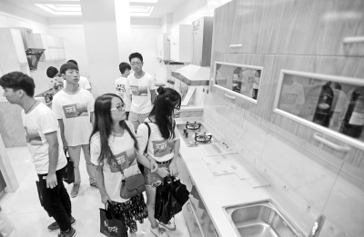 大学新生们看着房间模型,心中描绘着梦想中家的模样