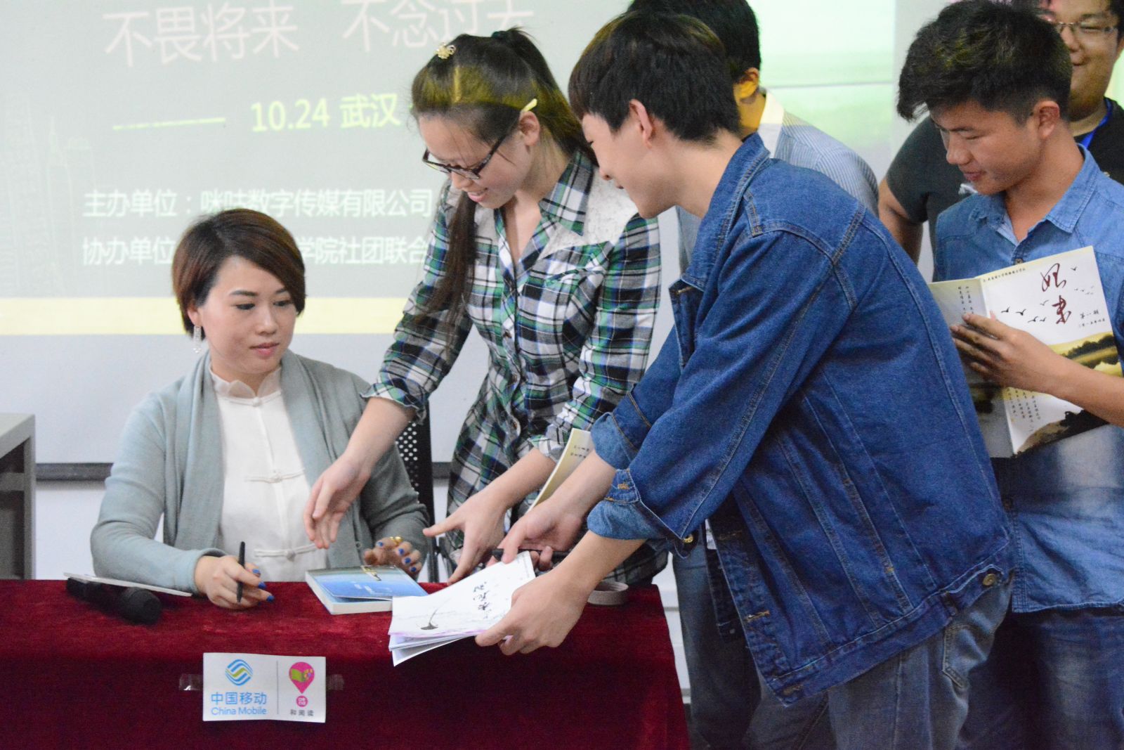 访谈结束后,十二老师给同学们提出自己的建议“如果你的青春没有燃烧好,那么它迟早会来”“不要超前消费自己的人生,谁说蓝颜不能变红彩”……接着她和同学们合影留念,并和读者进行了互动签名活动。(完)