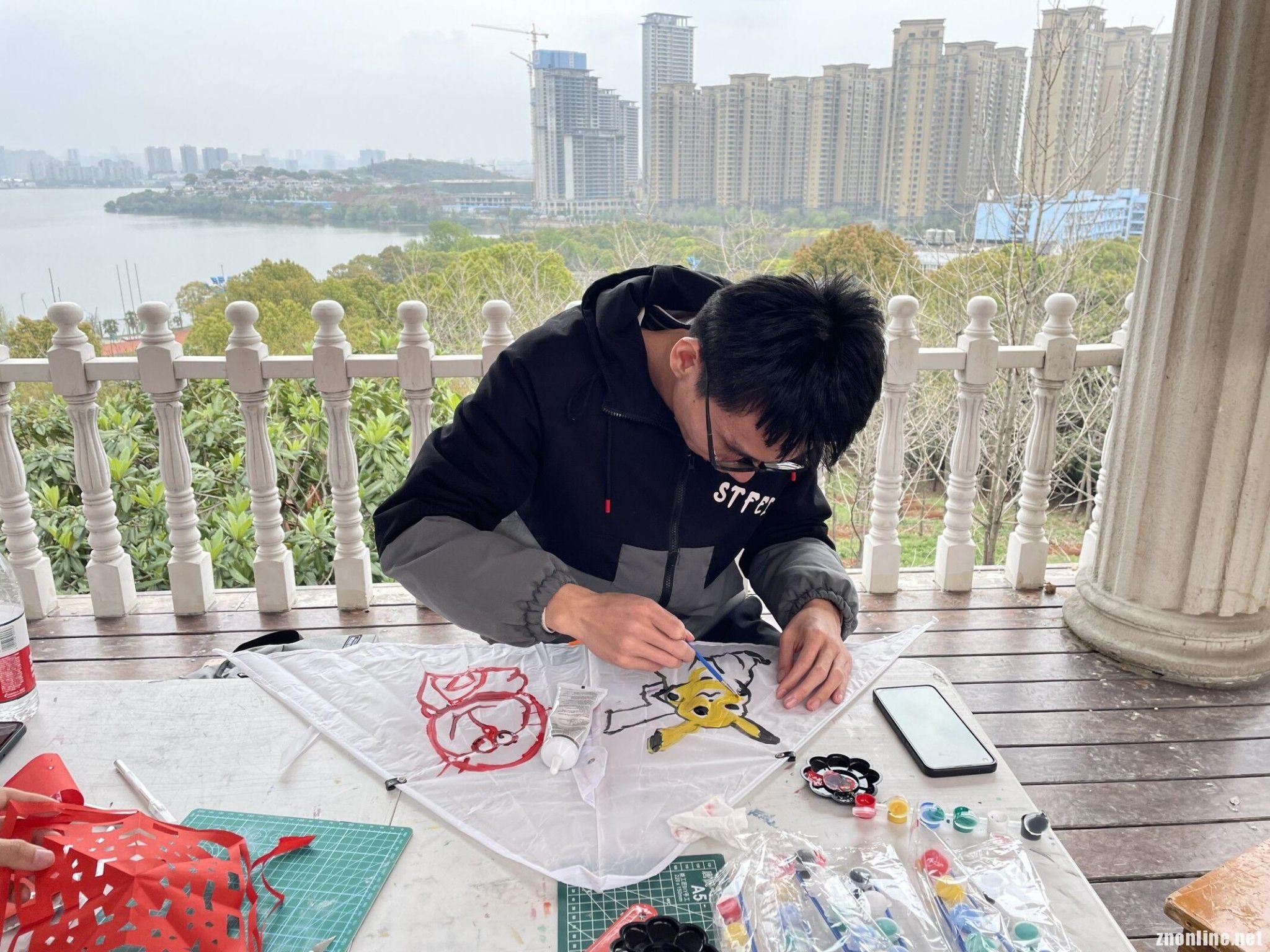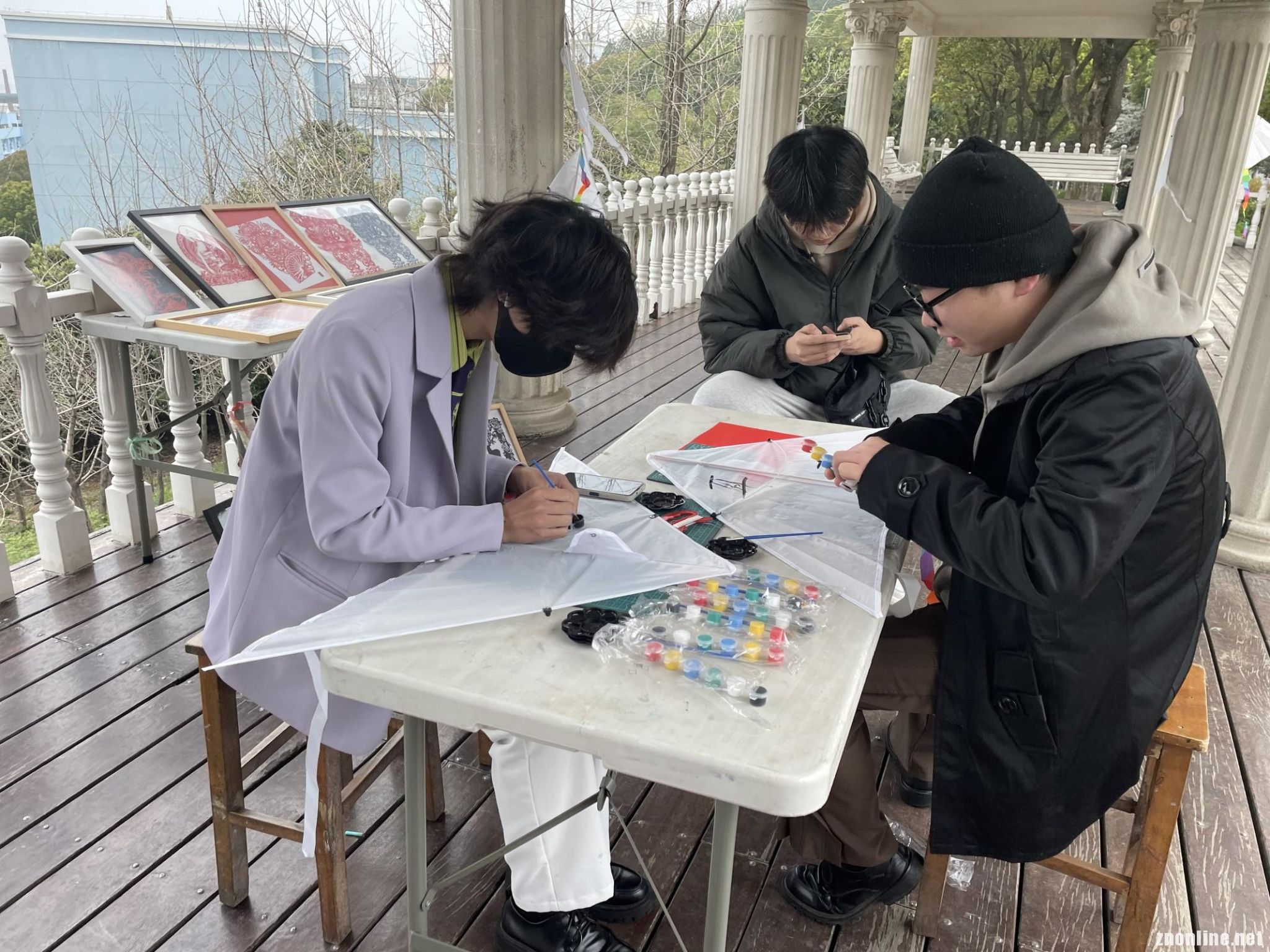 活动初期,同学们三五结伴一起来观赏风筝节活动,在心理部干事们的极力推荐下,有的聚在一起在便利贴上写着自己对未来的寄语,有的围在一起在风筝上画着自己喜欢的人物,还有的坐在一起在纸上剪着自己喜欢的图案,他们无一例外地交流着笑着。越来越多的同学们也驻足观看,都想趁着这次活动的机会尝试新鲜的东西。据了解参加任意一项活动的还会有一次刮奖的机会,所以现场还会时不时冒出一句“啊!我是二等奖!”的声音引人注目。