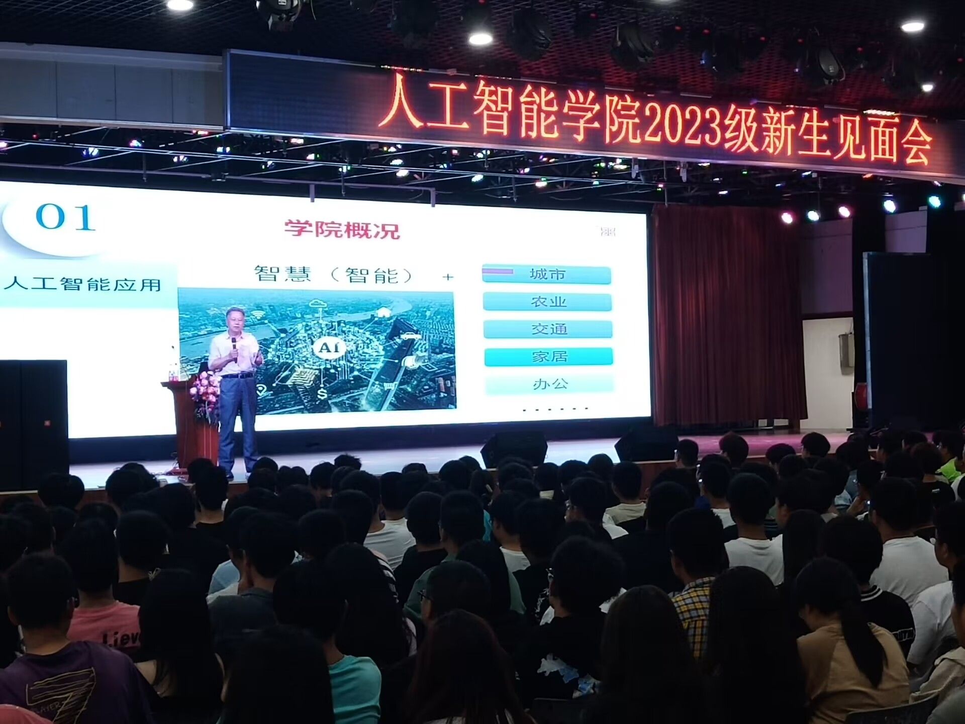 院长首先向新生介绍了什么是人工智能,以及什么叫专业。从最基本的概念入手,让新生对“人工智能”以及“专业”的概念有了更深刻的理解。随后,院长向新生讲述了专业之间的相互关系。他提出:“每个专业并不是独立的,只是某个领域的一个方向,专业之间是相互交叉,相互融合的。”最后,院长对新生进行了考研动员,并提出了几点生活建议。他希望新生能谋划好大学生活,谋划好考研、考公目标,学好每一门课程,转换角色,适应大学生活。