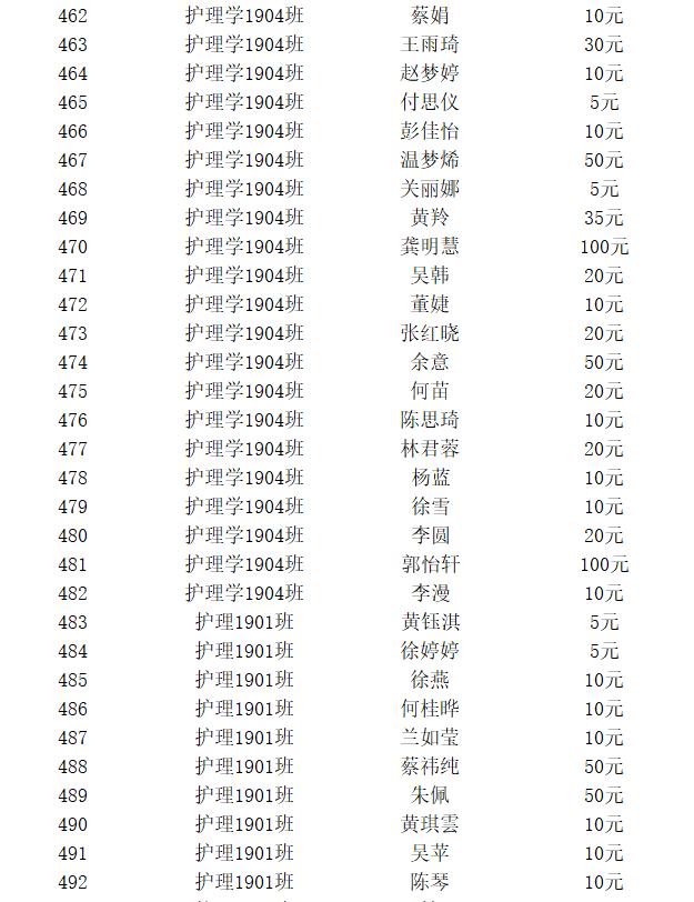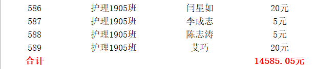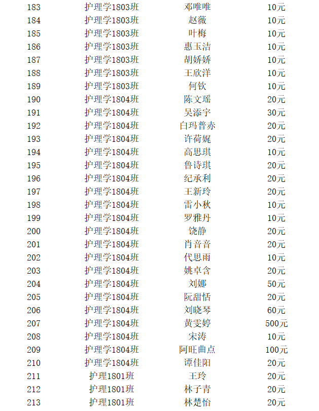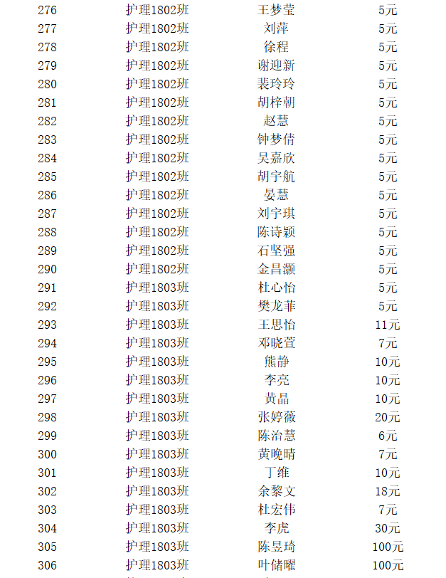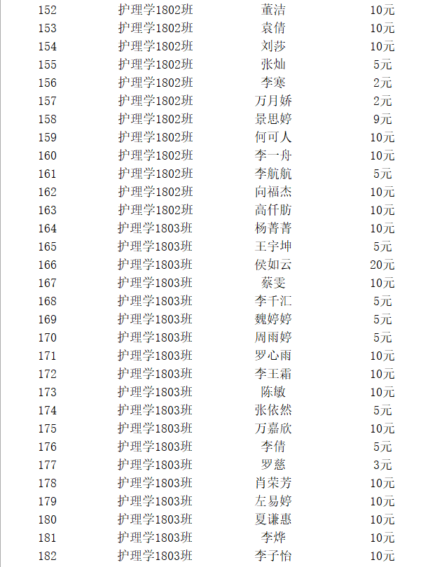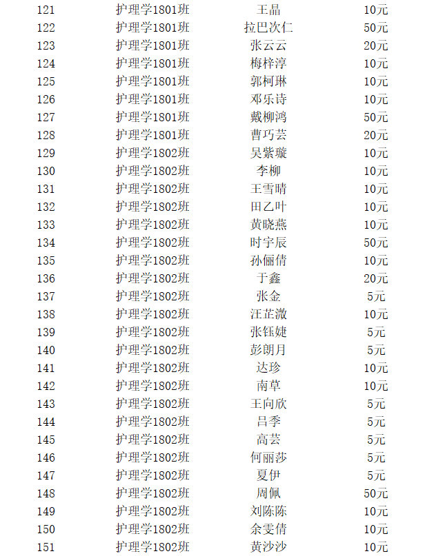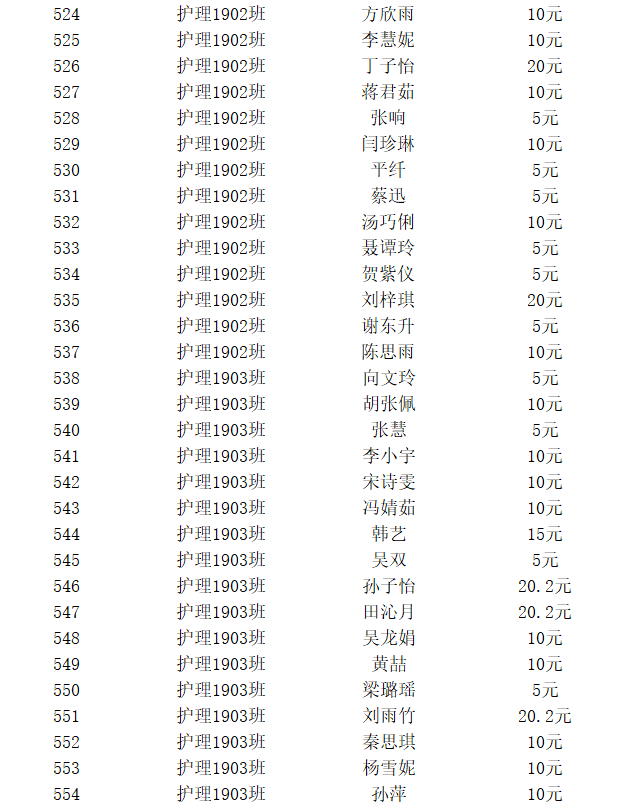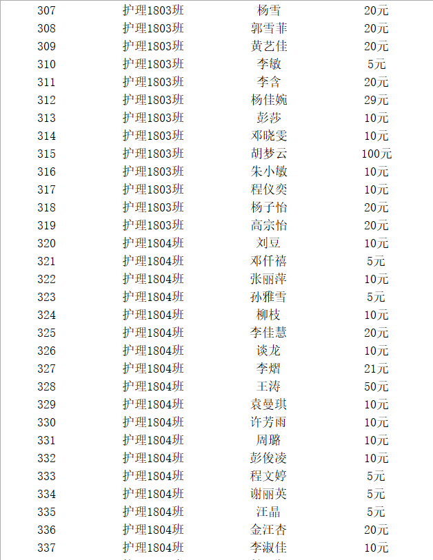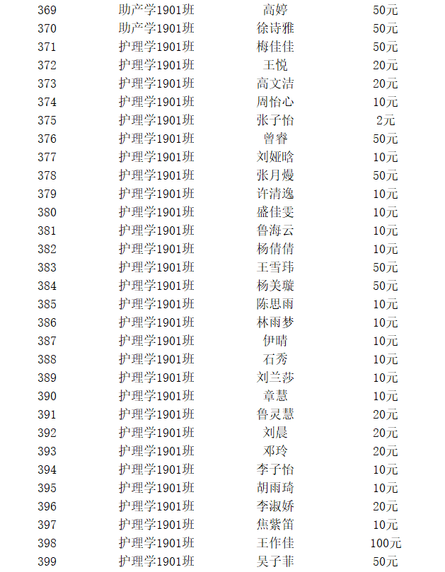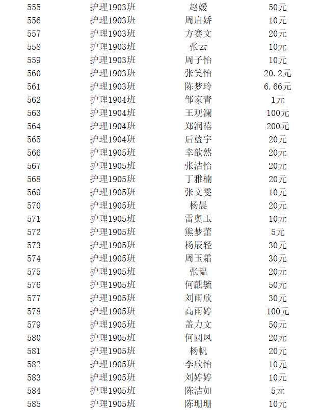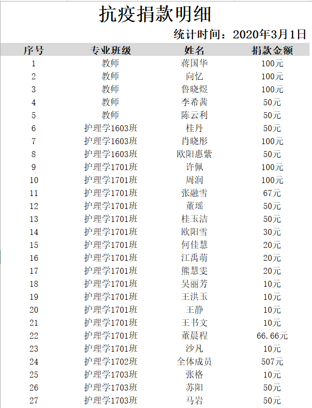 团委网3月2日消息新冠肺炎疫情牵动着所有中国人的心,为抗击疫情做一点力所能及的事,更是我们全校师生的共同心愿。为贯彻落实习近平总书记系列重要指示精神,响应党对团省委、校团委的号召。武昌理工学院护理学院师生积极响应,按照个人自愿原则,向抗击疫情一线医务人员的子女、因疫致困青少年捐出自己的一份爱。截止3月 2日,护理学院师生累计捐款14585.05元,参与捐款人数589人。现公示如下: