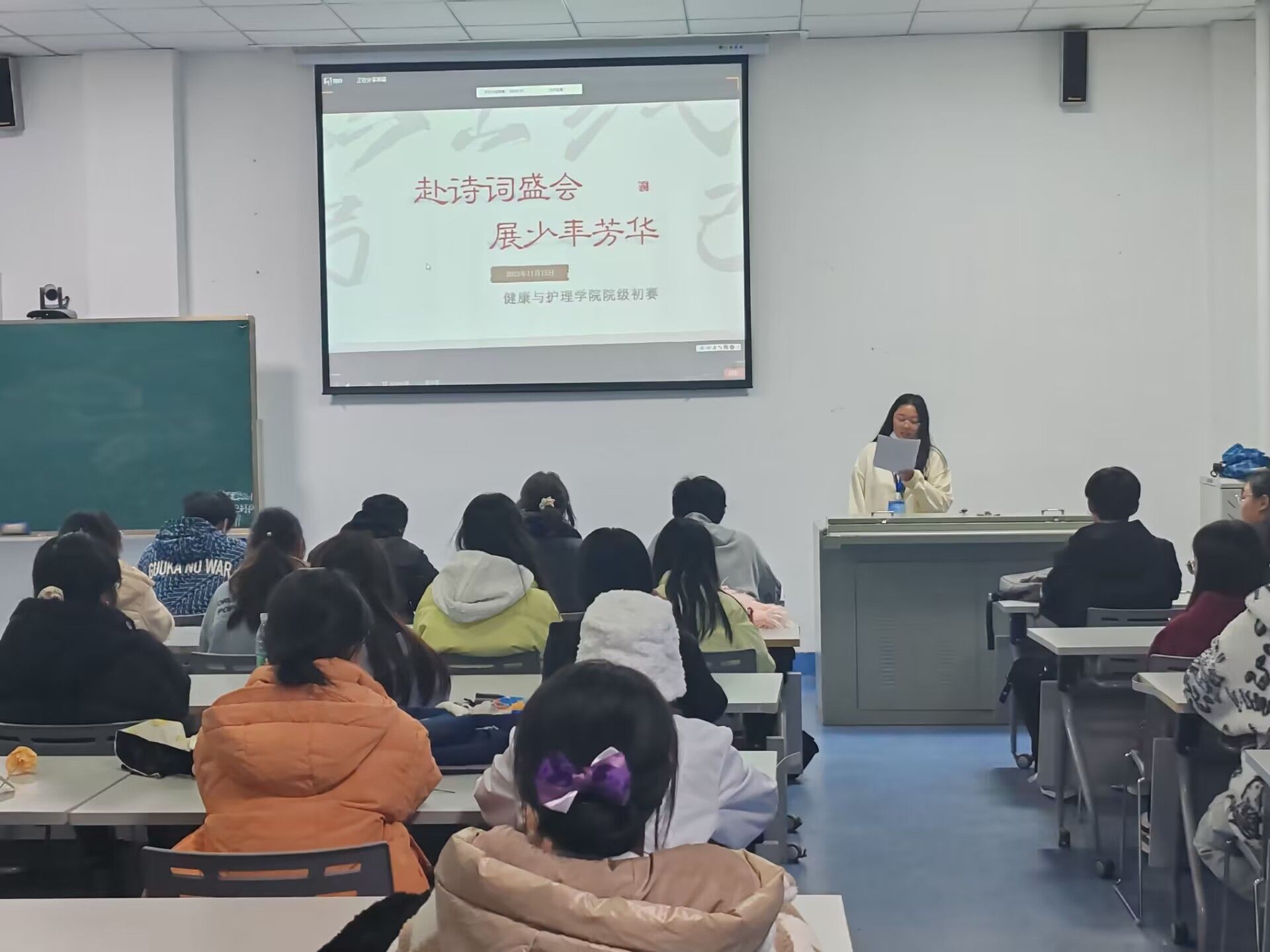 团委网11月16日消息(通讯员 张锦华 报道)中国是诗的国度,古典诗词是中国文化星河里最璀璨的明珠。为贯彻落实党中央、国务院“倡导全民阅读、建设书香社会”的战略部署,深入实施素质教育,深入开展读书活动,引领学生走进中华优秀传统文化,享受阅读的快乐,养成良好的阅读习惯,落实“成功素质教育理念”,营造立德树人的校园文化氛围,将经典古诗词与新时代精神相结合。武昌理工学院健康与护理学院于2023年11月15日晚上18:30在健康与护理学院107教室开展“赴诗词盛会,展少年芳华”诗词问答挑战赛院级初赛。
