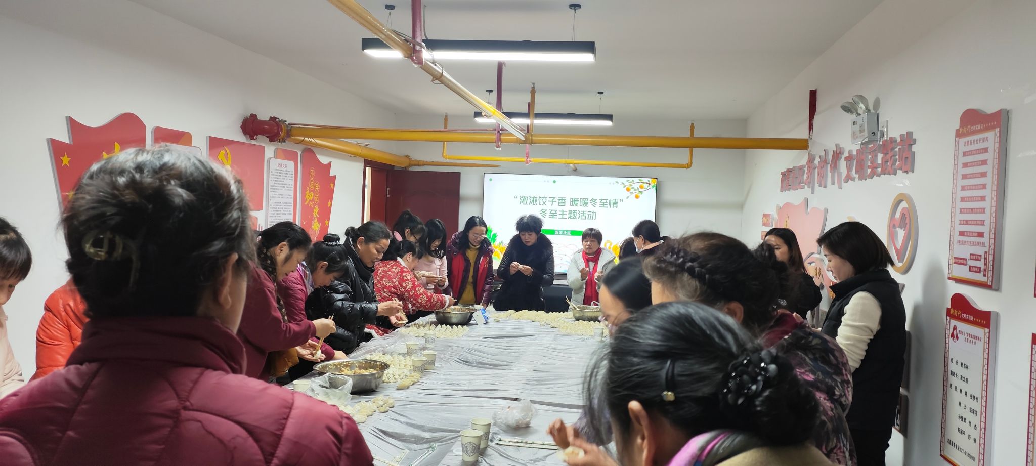 在活动期间,参与活动的社团成员准时到达集合地点进行活动材料采集后一起前往活动地点——西潭社区,在进入社区后参与者换上了红色志愿者马甲,热情洋溢地加入包饺子队列,尽管事前有进行包饺子的学习,但有些参与者仍然不是很熟练,老人也十分热情的对参与者进行了指导,与此同时在包饺子的过程中,老人们也积极参与其中,互相交流着包饺子的技巧和经验。有的老人还现场传授了自己的独特手法,让其他老人受益匪浅。这样的互动不仅让老人们感受到家的温馨,也拉近了彼此之间的距离。活动结束后,社团成员与参与老人和社区负责人进行了合影。